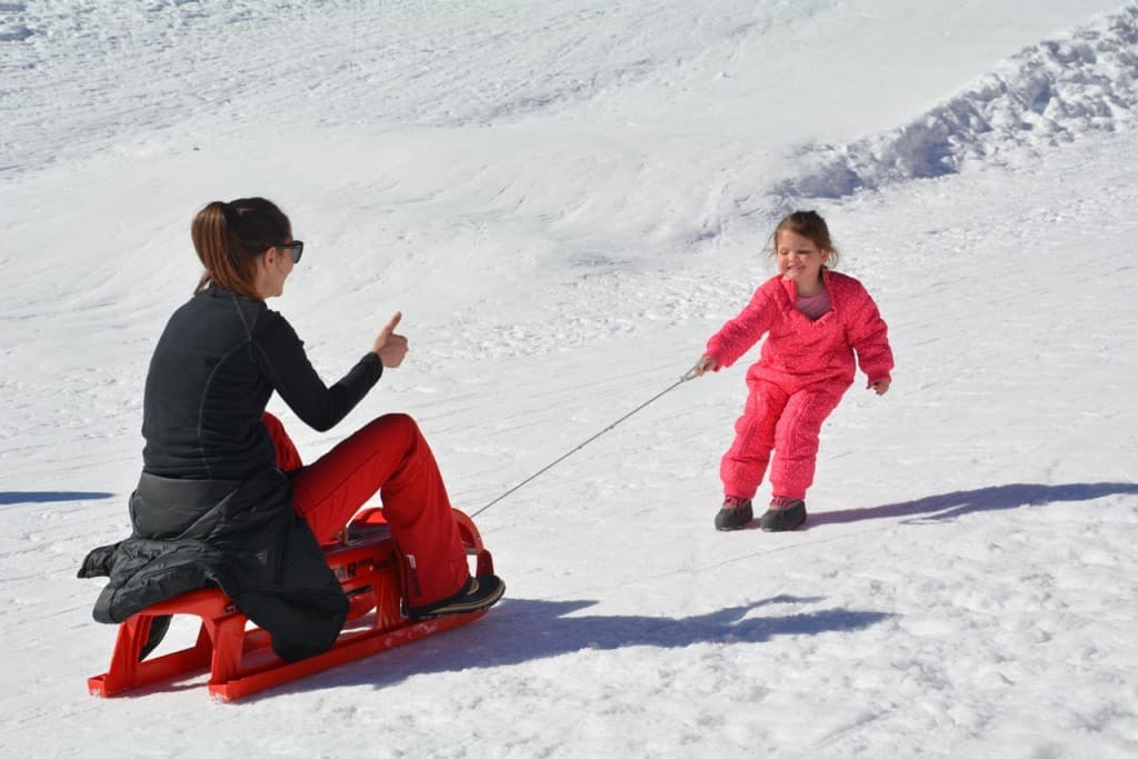 Ker smo predvsem odšli na počitnice na sneg, ravno zaradi naše 2,5 letne punčke, smo k temu primerno poskrbeli, da bo njen dan usklajen z njenimi potrebami. Ni nam ravno uspelo izpolniti vseh njenih pričakovanj, saj če bi bilo po njeno, bi bila čokolada namesto vsakega obroka, igranje na igralih bi zamenjalo popoldanski spanec in vodo bi zamenjala vroča čokolada. Zato smo se pogajali sto na uro. Če otroka pelješ na najvišjo točko na sankališču in mu rečeš, da se bomo zdej spuščali s sanmi (in je to zanj prvič), ga preplavita tako adrenalin kot strah. Po prvem spustu, ki je potekal v znaku joka in veselja, je bila naša mulčica ob pristanku na cilju takoj pripravljena za novi spust. Zelo pomembna stvar v taki »športni panogi« z otrokom je, da ga znaš držati na adrenalinskem nivoju. Zato smo mi tekmovali (seveda je Suriyah zmagovala), se vmes ustavljali, se metali v zasnežene ob-poti, delali angelčke in se kotalili v dolino po globokem snegu. Naša psička ni bila izjema.